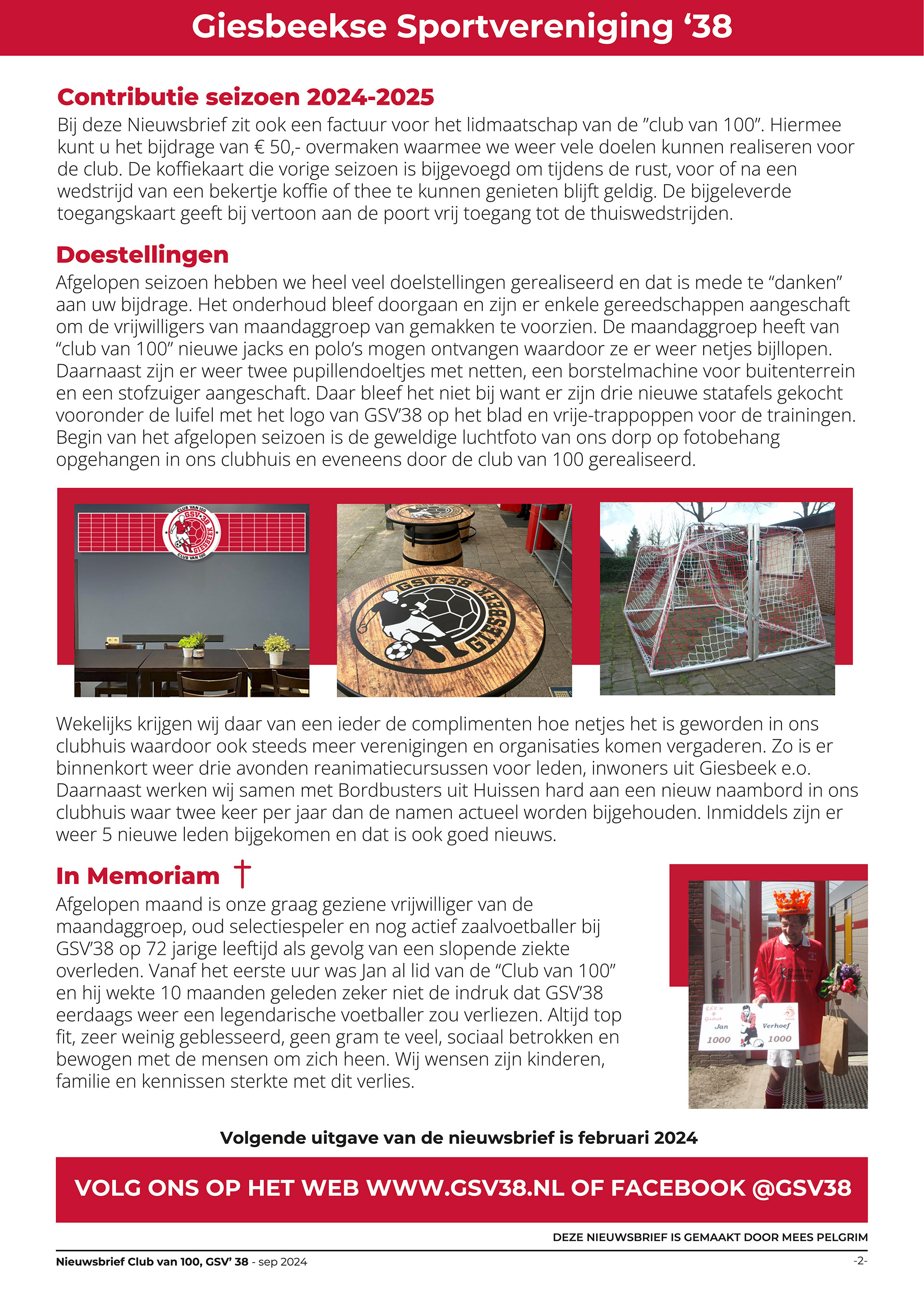 Voor mijn voetbalvereniging maak ik om het halfjaar 2 nieuwsbrieven; één voor de Club van 100 en één algemene nieuwsbrief voor alle leden. Het proces verloopt als volgt: ik ontvang alle teksten en afbeeldingen, waarna ik deze verwerk in een visueel ontwerp. Mijn doel is om aantrekkelijke en duidelijke brief te ontwerpen.